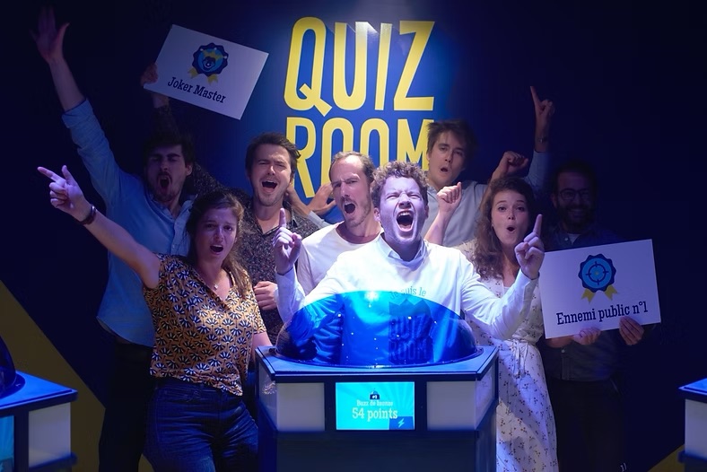 Quiz Room c’est quoi ? C’est un jeu qui se joue entre 4 et 18 joueurs en immersion totale sur un plateau télé !! Devant votre pupitre en solo ou en duo vous allez buzzer pour marquer le plus de points. Attention pour gagner un max de points, il ne suffit pas de connaître toutes les capitales du monde. Et oui ! Vous pouvez bloquer ou voler vos adversaires grâce au système de jokers.